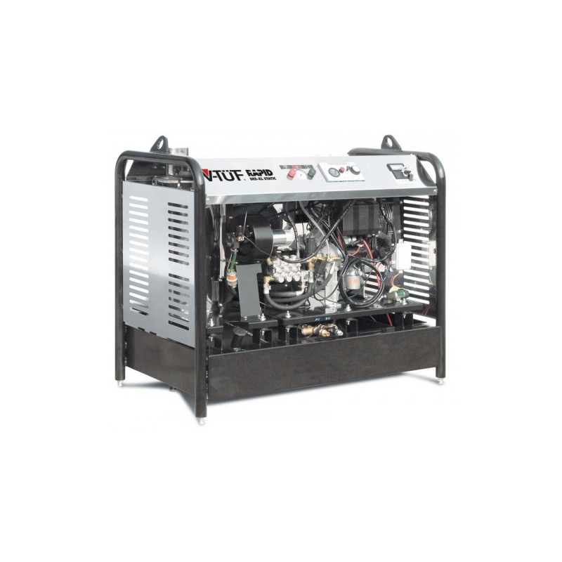 V-TUF RAPID DES XL STATIC SUPER HEAVY DUTY 35HP, low revving diesel engine driven HOT pressure washer. 300BAR (4410PSI) at 15 litres per minute. The low revving 35HP diesel engine (1800RPM) with shock absorbing flexi-drive coupling means that the RAPID DES XL can work for long hours whilst protecting the transmission from wear and the high running costs normally associated with this type of machine. The RAPID DES XL also comes with an automatic accelerator which saves fuel and reduces noise. The degreasing efficiency of hot water is your perfect high pressure cleaning partner to clean off the tough dirt.