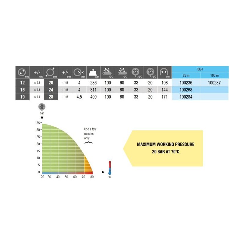 | Fuel & Oil Hose Bore: DN 19 Diameter: 29mm Max: 20 BAR Max: 80°C Weight: 0.5 kg |