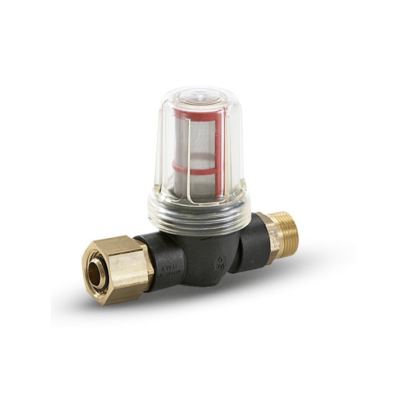 Fine-mesh water filter, 100 μm, max. temperature 60°C. Connects to high-pressure cleaner. Protects the high-pressure cleaner from dirt particles contained in the water. Water flow rate up to 1200 l/h. Connector 1".